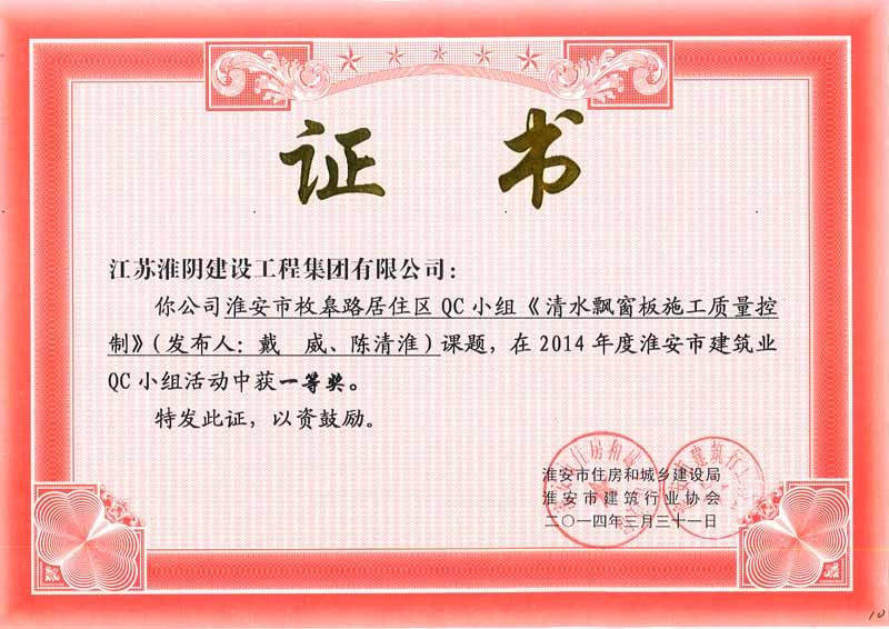 2014年度QC一等獎(jiǎng)淮安市枚皋路居住區(qū)《清水飄窗板施工質(zhì)量控制》戴威、陳清淮