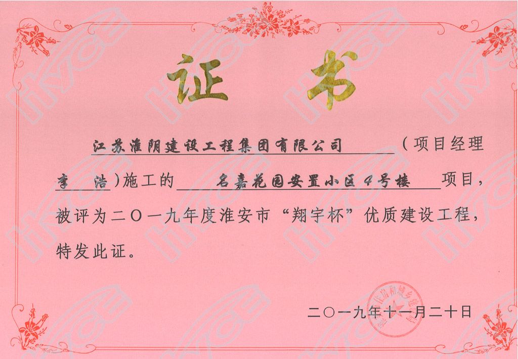 淮安市“翔宇杯”優(yōu)質(zhì)建設(shè)工程-名嘉花園安置小區(qū)4號(hào)樓