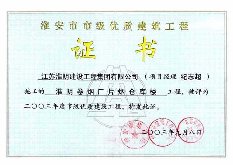 2003年市級優(yōu)質(zhì)工程淮陰卷煙廠片煙倉庫樓(紀志超)