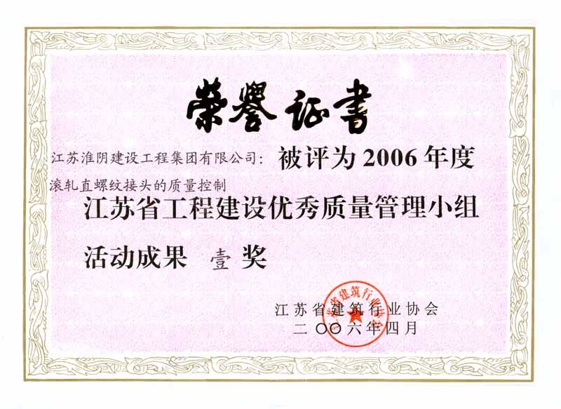 2006年省工程建設(shè)優(yōu)秀質(zhì)量管理小組活動(dòng)成果壹等獎(jiǎng)-滾軋直螺紋接頭的質(zhì)量控制