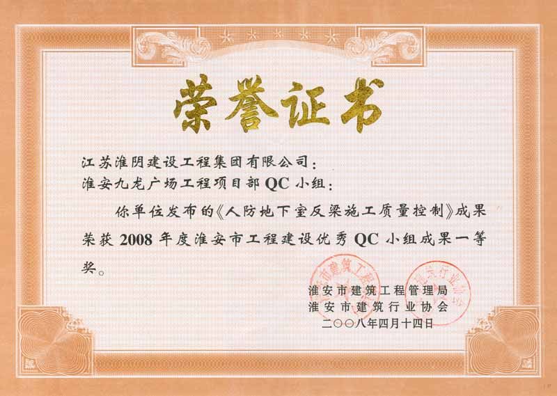 2008年市級(jí)QC一等獎(jiǎng)(淮安九龍廣場(chǎng)-人防地下室反梁施工質(zhì)量控制)