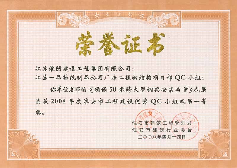 2008年市級(jí)QC一等獎(jiǎng)(江蘇一品梅紙制品公司廠房-確保50米跨大型鋼梁安裝質(zhì)量)