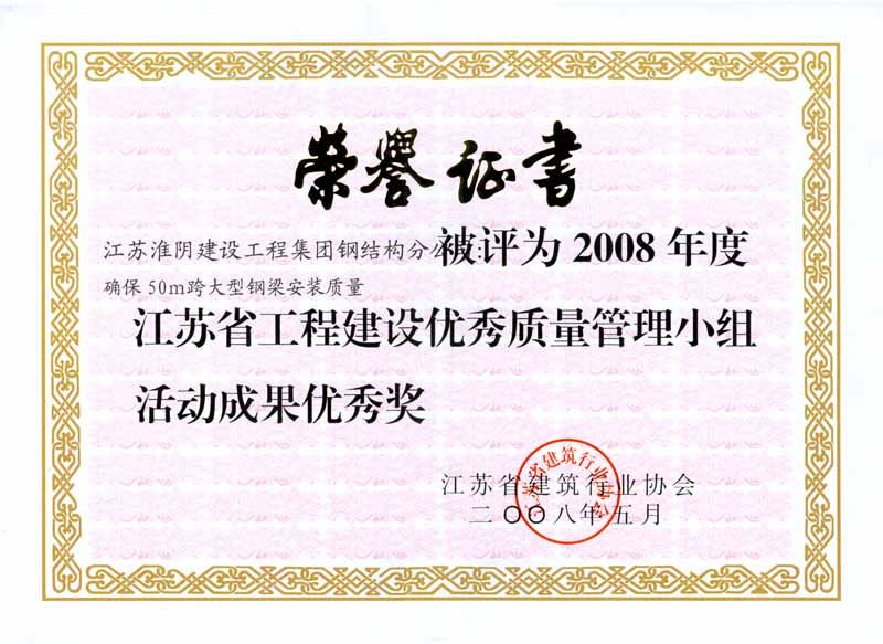 2008年省工程建設(shè)優(yōu)秀質(zhì)量管理小組活動(dòng)成果優(yōu)秀獎(jiǎng)-確保50M跨大型鋼梁安裝質(zhì)量