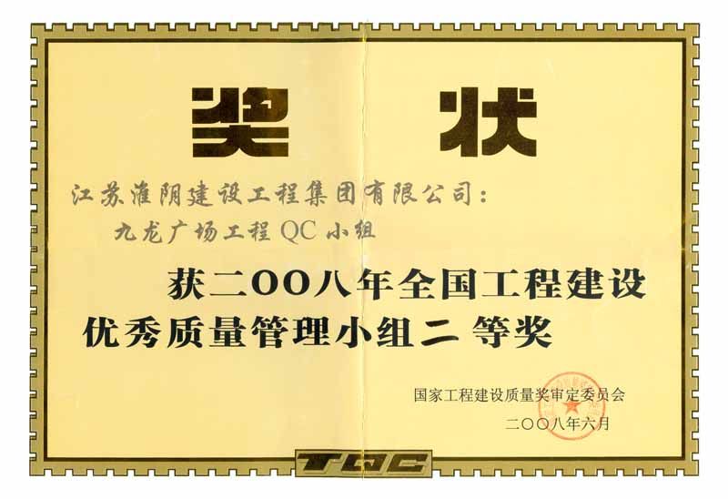 2008年全國(guó)工程建設(shè)優(yōu)秀質(zhì)量管理小組二等獎(jiǎng)-九龍廣場(chǎng)