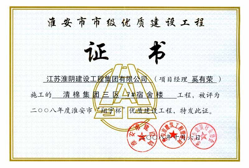 2008年市翔宇杯清棉集團三區(qū)7#宿舍樓-奚有榮