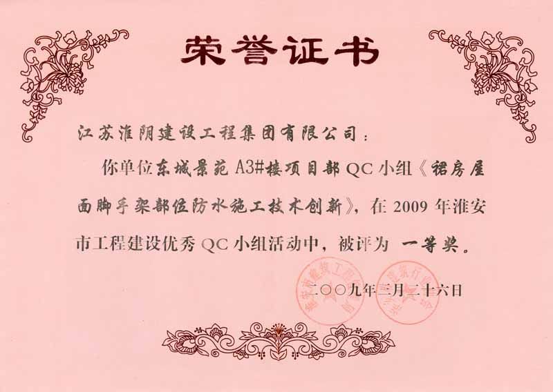 2009年市QC一等獎(東城景苑A3#樓項目部-裙房屋面腳手架部位防水施工技術(shù)創(chuàng)新)