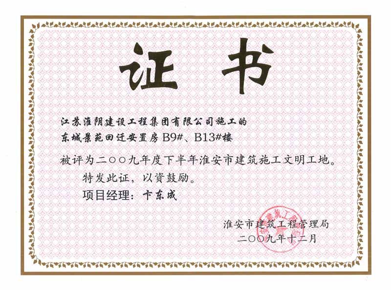 2009年市文明工地東城景苑回遷安置房B9#、B13#樓(卞東成)