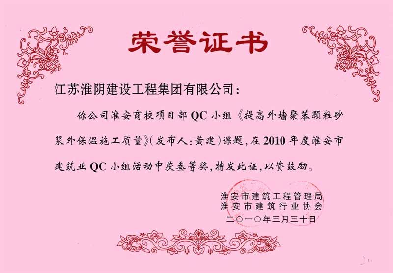 2010年市QC(三等獎(jiǎng))提高外墻聚苯顆粒砂漿外保溫施工質(zhì)量(淮安商校項(xiàng)目部-黃建)