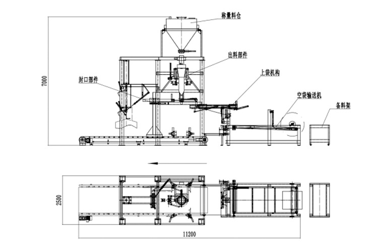 全自動(dòng)機(jī)器上袋氧化鋁噸袋包裝機(jī)主要機(jī)構(gòu):氧化鋁空袋輸送機(jī)構(gòu)、自動(dòng)上袋機(jī)構(gòu)、氧化鋁自動(dòng)稱量機(jī)構(gòu)、氧化鋁自動(dòng)灌裝機(jī)構(gòu)、自動(dòng)熱合封口、自動(dòng)噴碼打印、氧化鋁自動(dòng)輸送機(jī)構(gòu)。簡略圖紙如下: