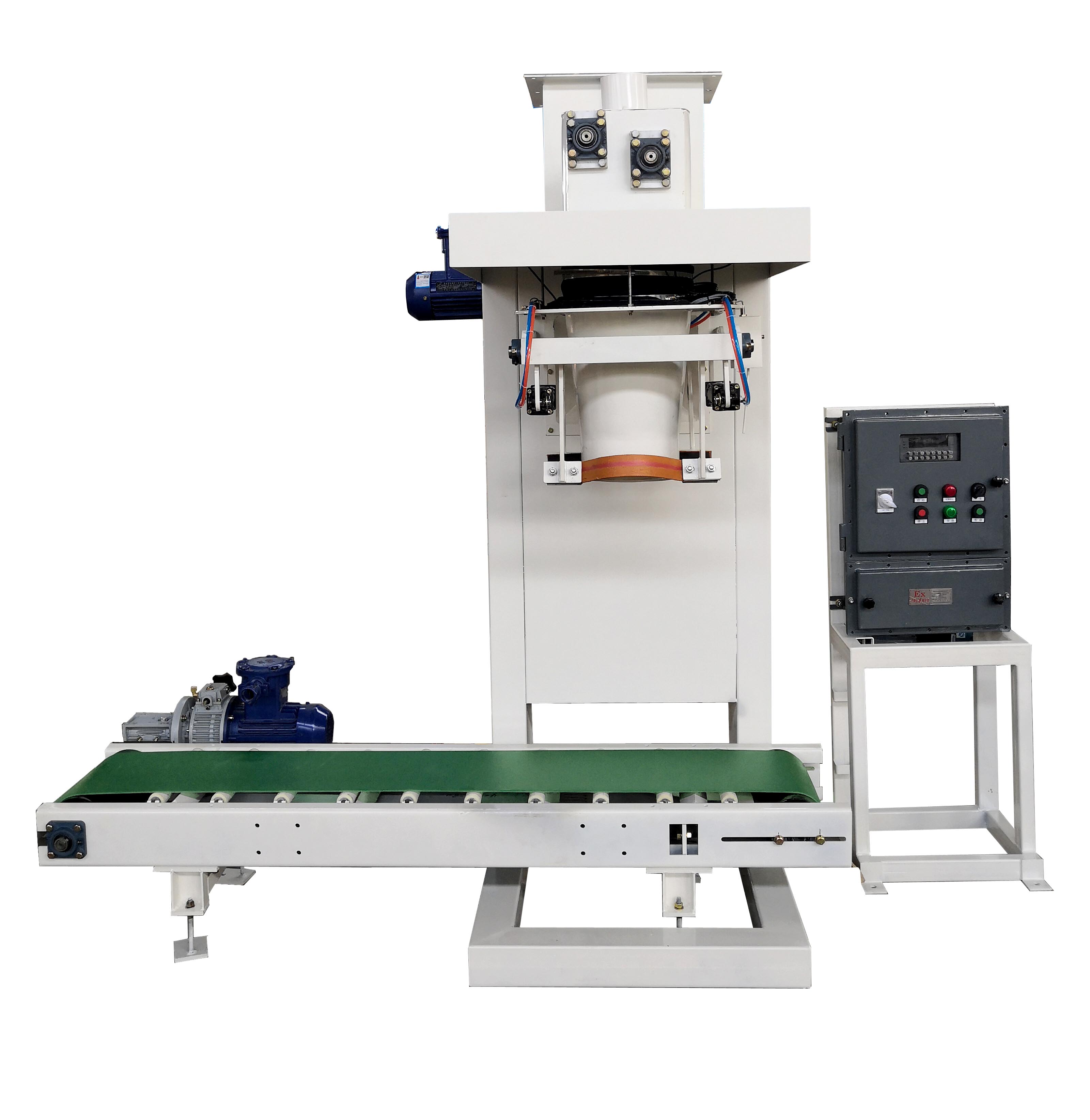 麩皮定量包裝秤DCS-50F工作原理:包裝前需人工在儀表上設(shè)定目標重量,客戶可根據(jù)需求自行調(diào)整,人工將包裝袋套入下料口,撥動夾帶開關(guān),控制系統(tǒng)接收到套袋信號后驅(qū)動氣缸,由夾帶器將包裝袋夾住,同時啟動給料機構(gòu)將料倉內(nèi)的麩皮送入包裝秤,送料機構(gòu)為雙螺旋送料,達到目標重量時,螺旋停止給料,夾帶器自動打開,包裝袋自動落到輸送機上,輸送機將包裝袋向后輸送進行人工輔助縫口,向后輸送,完成一次裝袋過程。